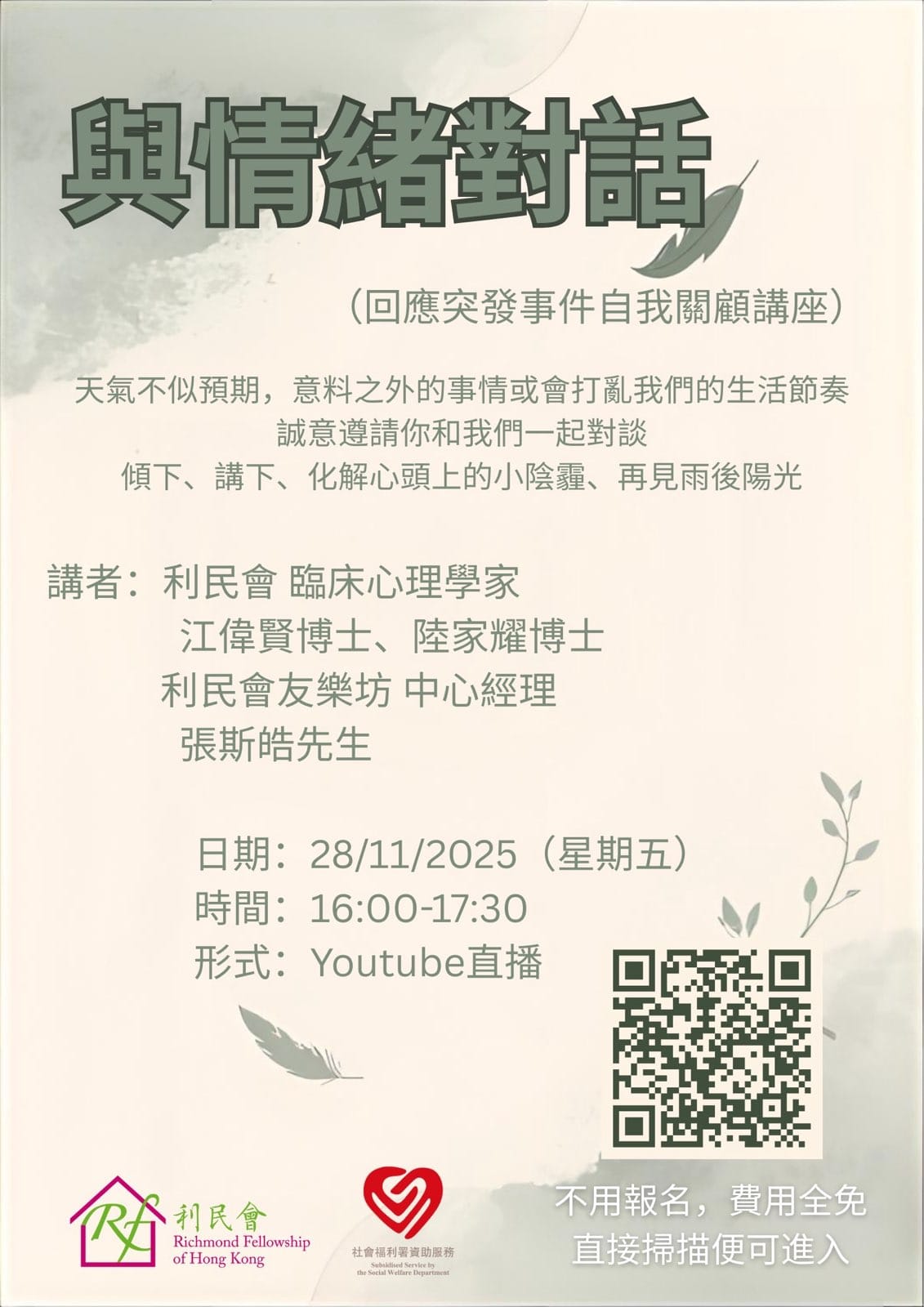 為提供適切的情緒輔導,利民會臨床心理學家於11月28日下午4時舉行「與情緒對話」網上講座,並會將此影片放在YouTube (利民會頻道)上,供有需要人士日後參考。此外,我們的精神健康服務社工可提供情緒支援幫助,請向有關單位聯絡: